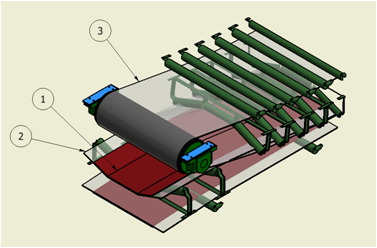 The DSI Adder Snake (see Figure 1 and Figure 3), which is currently patent pending, solves the problem by swallowing the narrower conventional belt (Item 1), along with its material, into the two wider sandwich belts (Items 2 and 3). This allows the material to enter the sandwich belts with minimal disturbance and without the energy loss and additional equipment required for a standard transfer.